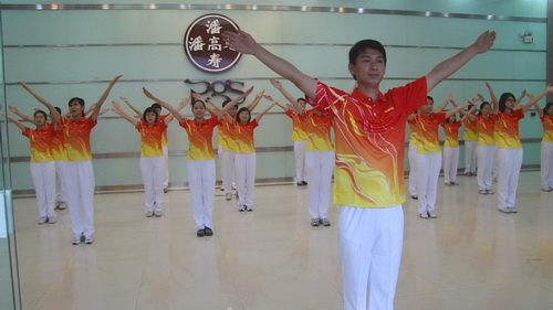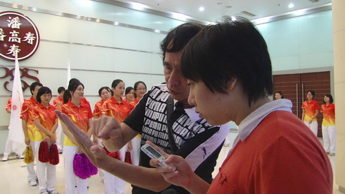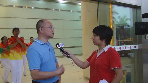 領(lǐng)操戎全剛向記者介紹助威操排練情況