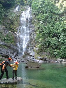 飛水潭在半山腰上,走過重重疊疊的山路,忽覺清涼,只見一條瀑布從山崖飛落。水流匯成一泓碧水,中有巨石,上刻“枕流”2字。廣州附近的瀑布不多,比之人工瀑布白水寨,雖然飛水潭的水不是特別大,但山水的色澤氣息加之潤澤的山石植被都要正很多。