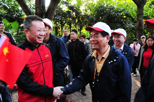 辭舊迎新,潘高壽,“攀高壽”。一早,由公司工會、黨辦組織的登山活動的人群就集結在白云山腳,員工及家屬上千人秩序井然,由公司領導引領前行,向山頂進發。打著“弘揚亞運精神”、“造福社會百姓”、“市場銷售、勇攀高峰”、“創造一流藥品”等橫幅。員工、家屬們個個精神抖擻;口號聲、歌聲響徹山頂公園、摩星嶺。領導領唱、員工、家屬齊和應,魏大華董事長總經理、鄭楠黨委書記等班子成員與員工家屬們融為一體,歌嘹亮、聲威壯,場景感人。而最令人矚目和動容的是,廣藥集團董事長、黨委書記楊榮明,副總經理施少斌、工會副主席寧志雄的光臨,一齊吶喊、一起高歌,為員工們加油、鼓勵!