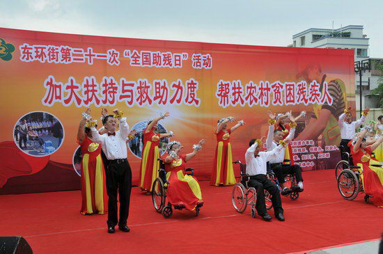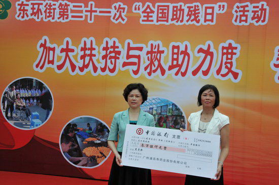 活動內容豐富——捐贈儀式、文藝表演、助殘義診等等,無不感人肺腑。潘高壽等公司弘揚濟人濟世、關愛社會的精神,向殘疾人奉獻愛心。鄭楠黨委書記代表公司向東環街殘聯捐贈了價值3.5萬元的保健品和飲料。同時,東環街殘聯回贈由該區殘疾人親手制作的禮花。此外,鄭書記參觀了東環街康園工療站,與殘疾人親切交談,送上暖暖的關愛慰問之情。