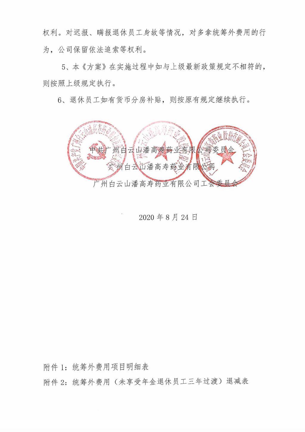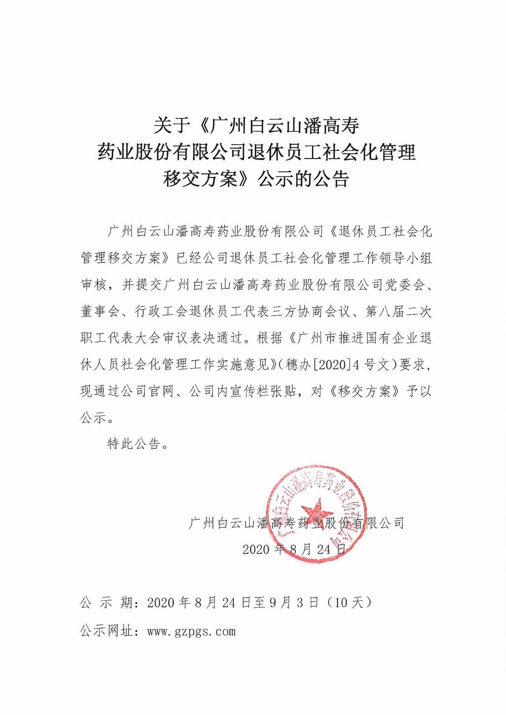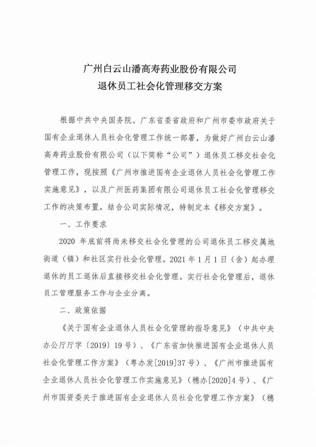 關(guān)于《廣州白云山潘高壽藥業(yè)股份有限公司退休員工社會化管理移交方案》公示的公告